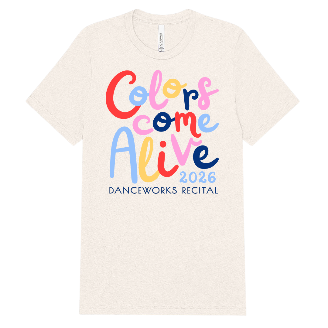 Recital t-shirts feature the 2026 Recital logo printed on a soft-feel shirt (Bella + Canvas brand).