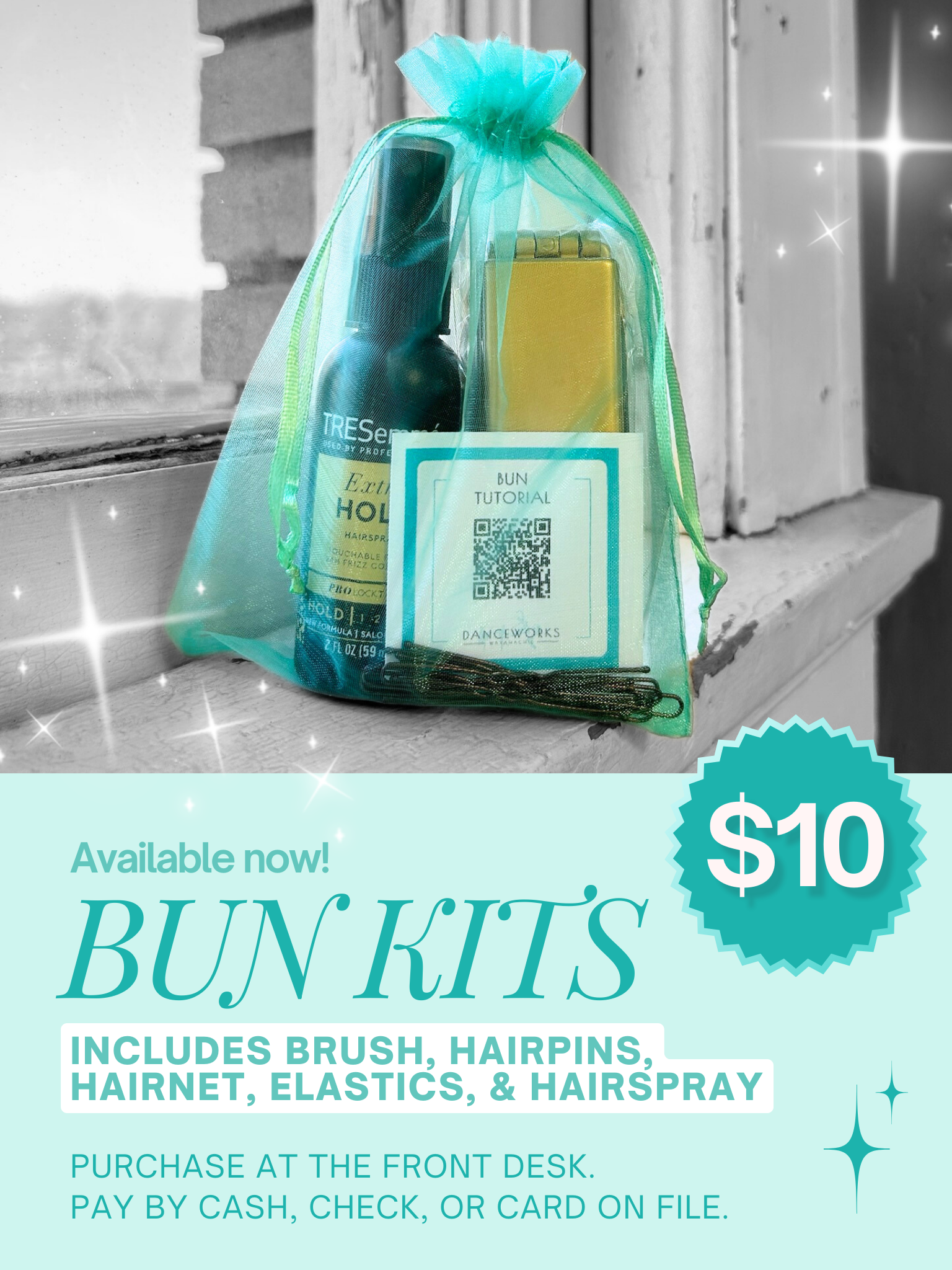 We are selling bun kits for $10 each. Each kit includes a brush, hair elastics, hairpins, a hairnet, and hairspray. Order yours by clicking the button below, and pick it up at the front desk.